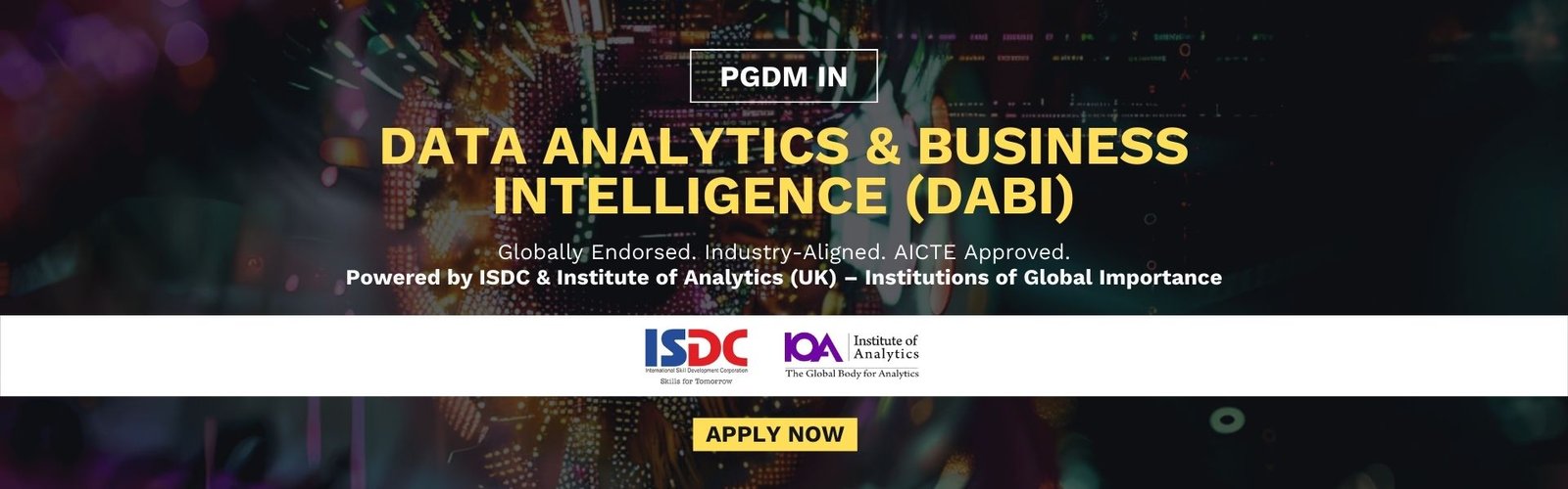 The PGDM – Certification in Data Analytics & Business Intelligence is designed to develop analytical and strategic business leaders. It is offered in collaboration with ISDC and the Institute of Analytics (UK), provides international certification and hands-on learning in key data domains. Core modules: