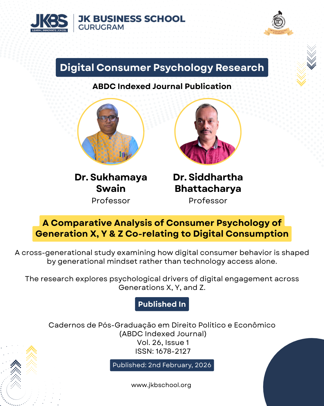 At JK Business School, Gurugram, we take immense pride in our faculty’s ongoing research contributions to contemporary fields such as digital consumer psychology. One such notable achievement comes from Dr. Sukhamaya Swain and Dr. Siddhartha Bhattacharya, whose recent research study, “A Comparative Analysis of Consumer Psychology of Generation X, Y & Z Co-relating to Digital Consumption,” has been published in an ABDC-indexed journal.