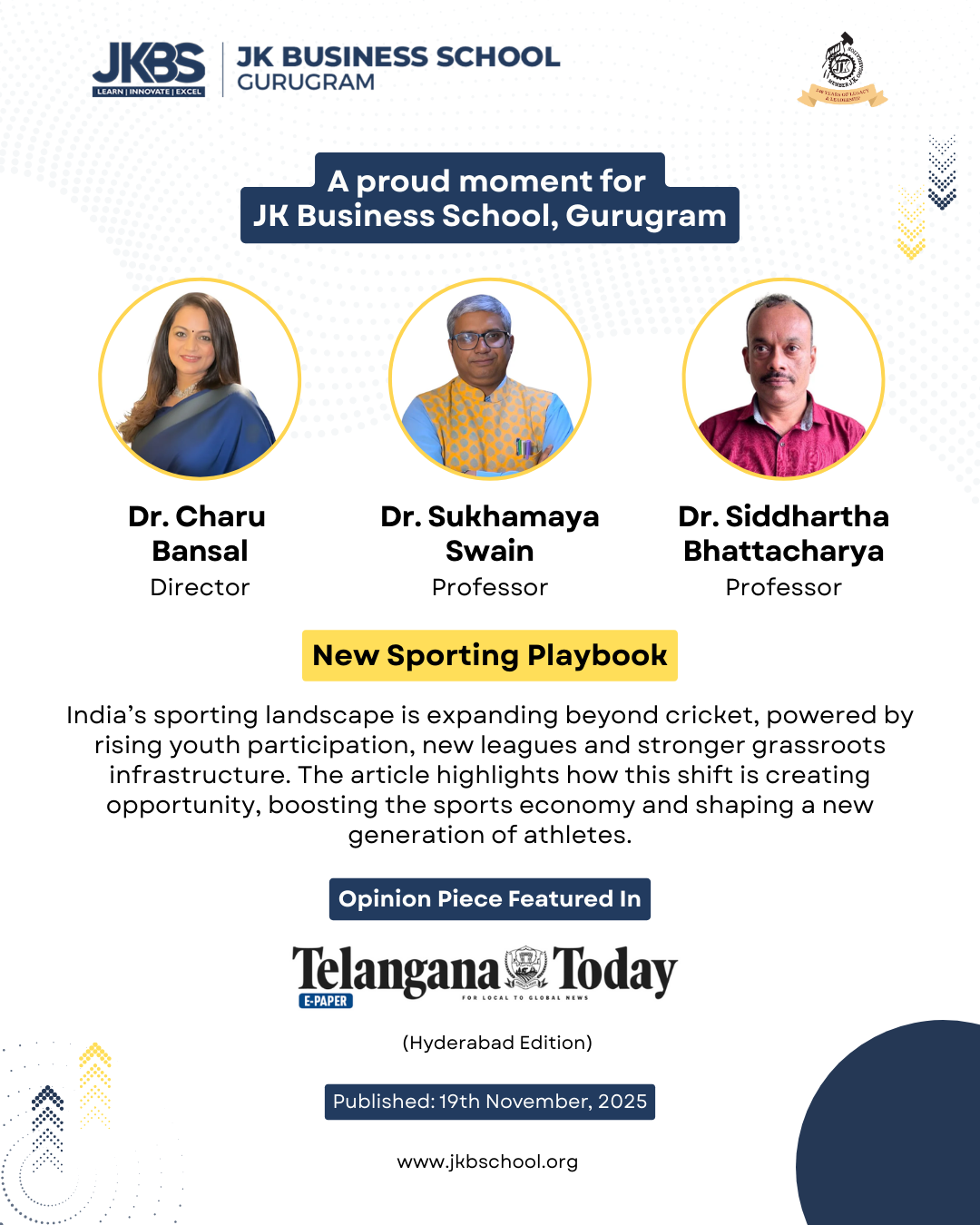 #JKBS #JKBusinessSchool #FacultySpotlight #ThoughtLeadership #SportsEconomy #Research #IndiaSports #HigherEducation #Gurugram